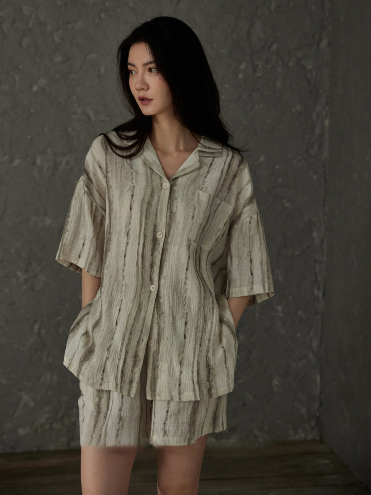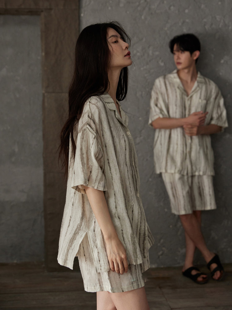 【25春夏新作】 涼しさとやさしさをまとう、 通気性に優れた天然コットンを採用し、やわらかな肌ざわりとひんやり心地よい涼感を両立。まるで雲にふんわり包まれているような軽やかさで、夏のリラックスタイムを快適にサポートします。 ゆったりとしたシルエットで動きやすく、ユニセックスで着用可能。上下セットのため、部屋着としてはもちろん、ワンマイルウェアとしても活躍します。 控えめで洗練されたデザインが、毎日の暮らしに涼しさと安らぎを添えます。パートナーとのおそろいコーディネートにもおすすめです。  |