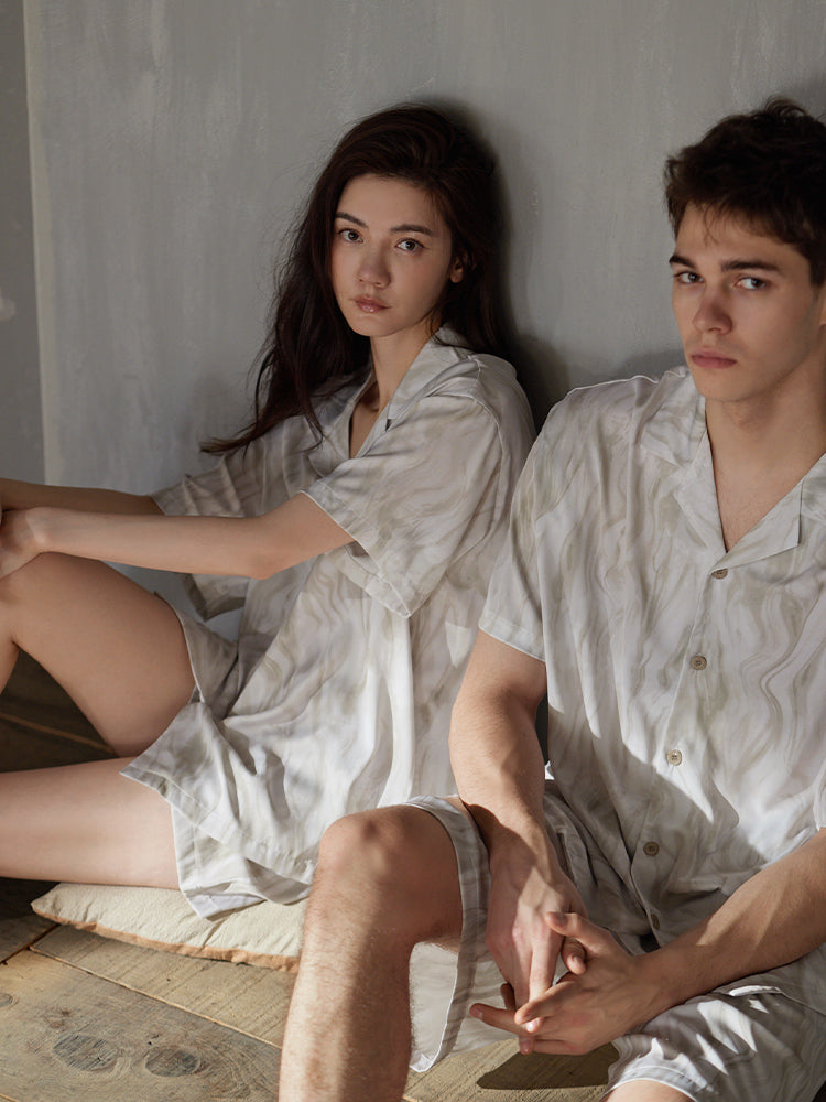 このカップルのパジャマスーツは、特に夏のために作られたもので、軽くて上質なアイスシルク生地を採用しています。シンプルなデザインで、男女ともに着やすく、ゆったりしたシルエットはおしゃれでカジュアルです。プリントは更に流行にぴったりで、色の組み合わせやスタイルの細部に関わらず、すべて独特のファッションセンスアップ!  |