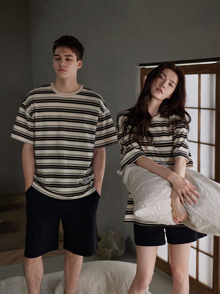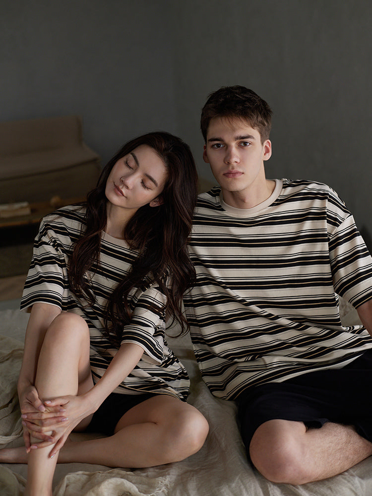 高品質の冷感コットン素材を採用しています。肌触りが柔らかく、着心地が良く通気性があり、特に夏に適しています。半袖のデザインにはスタイリッシュなストライプがあり、シンプルで品格が失われていません。部屋着として家の中でカジュアルに着ることもできますし、気軽に外出し、パートナーとの仲良さをアピールすることができます。男女同じのコーディネートデザインは様々なスタイルにフィットし、ゆったりとしており、ファッション感up。家や外でくつろぐときも、快適な体験ができます。  |