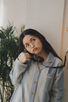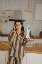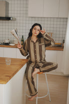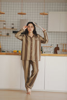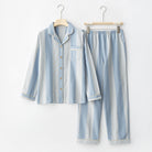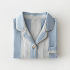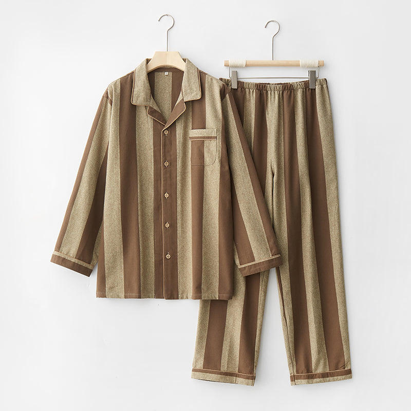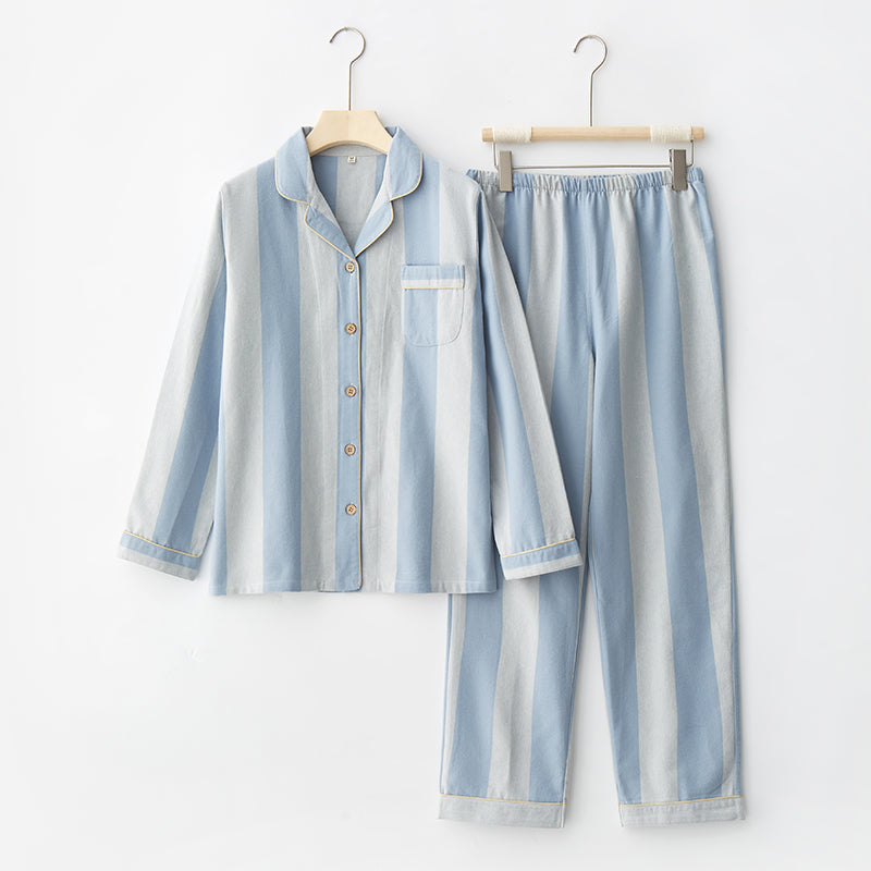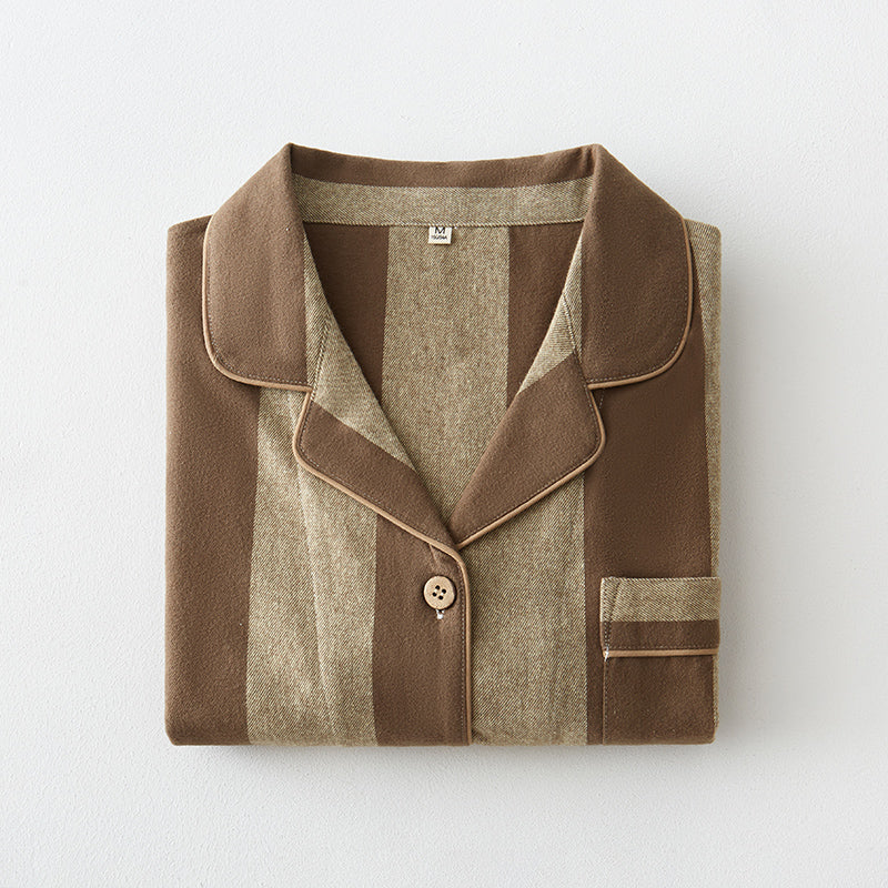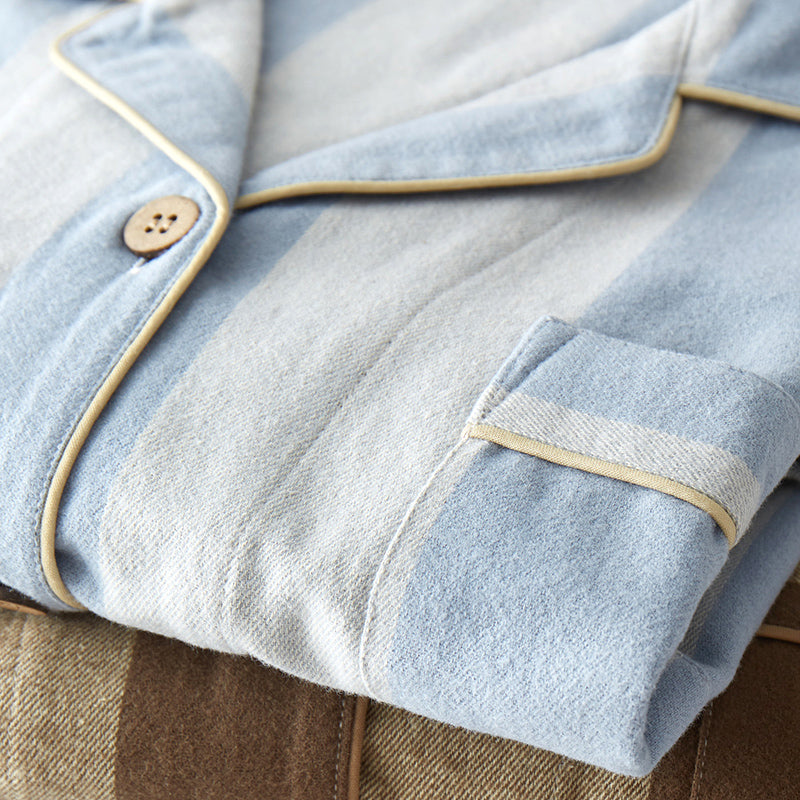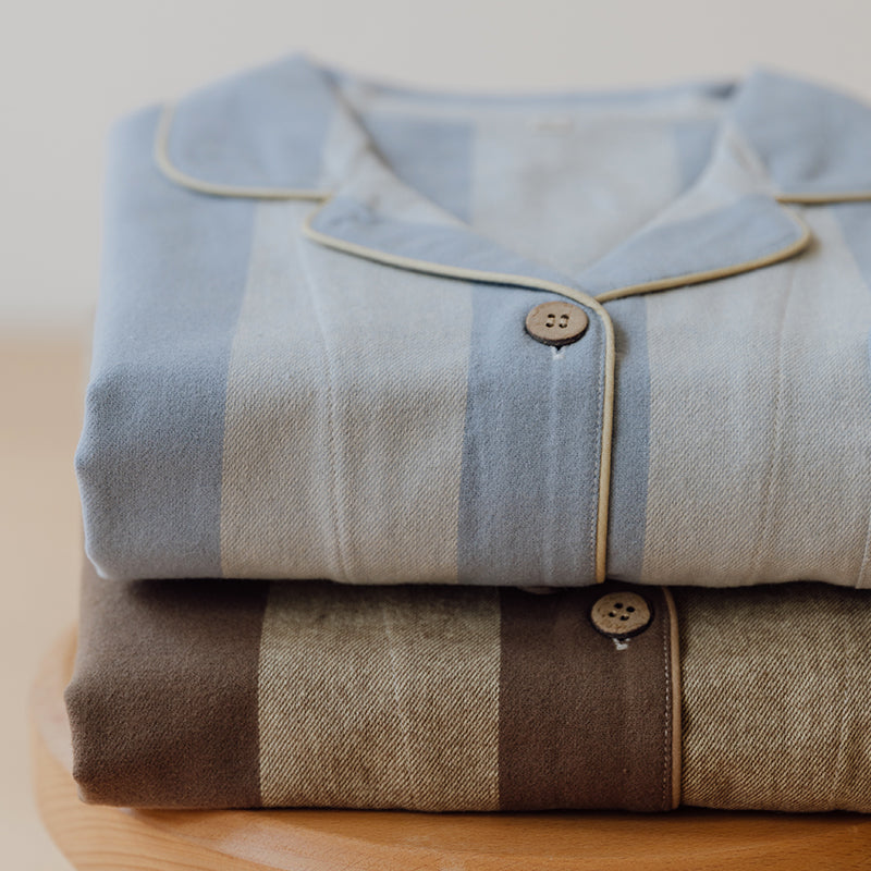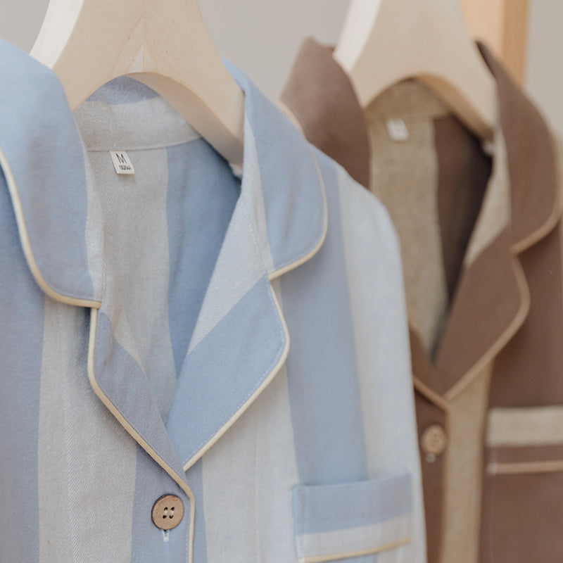 綿100%【上質ペアパジャマ】男女兼用 上品ブルー&ブラウンストライプ 襟付きボタン 長袖 ルームウェア 通気性 保温 快適な眠り 外出可能 【26年新作】