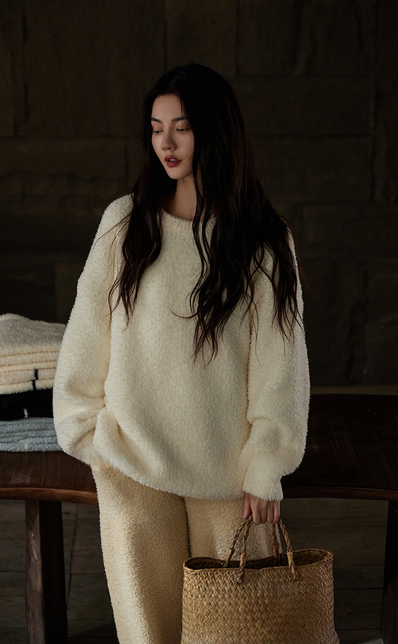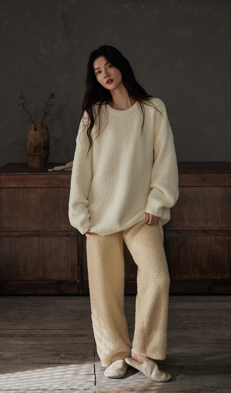 【25秋冬新作】 極上の柔らかさと温もりが魅力の秋冬用レディースパジャマ。 ふんわりとした綿素材に裏起毛を施し、寒い季節でも体を優しく包み込み、快適な眠りをサポートします。 上品な淡いイエローの無地カラーは、落ち着いた雰囲気と洗練された印象を与え、プルオーバータイプのシンプルなデザインで着心地も抜群。 リラックスしたくつろぎ時間を、まるでラグジュアリーなひとときのように演出してくれる一着です。 柔らかさ、温かさ、スタイリッシュさを兼ね備え、秋冬の夜を心地よく彩ります。  |