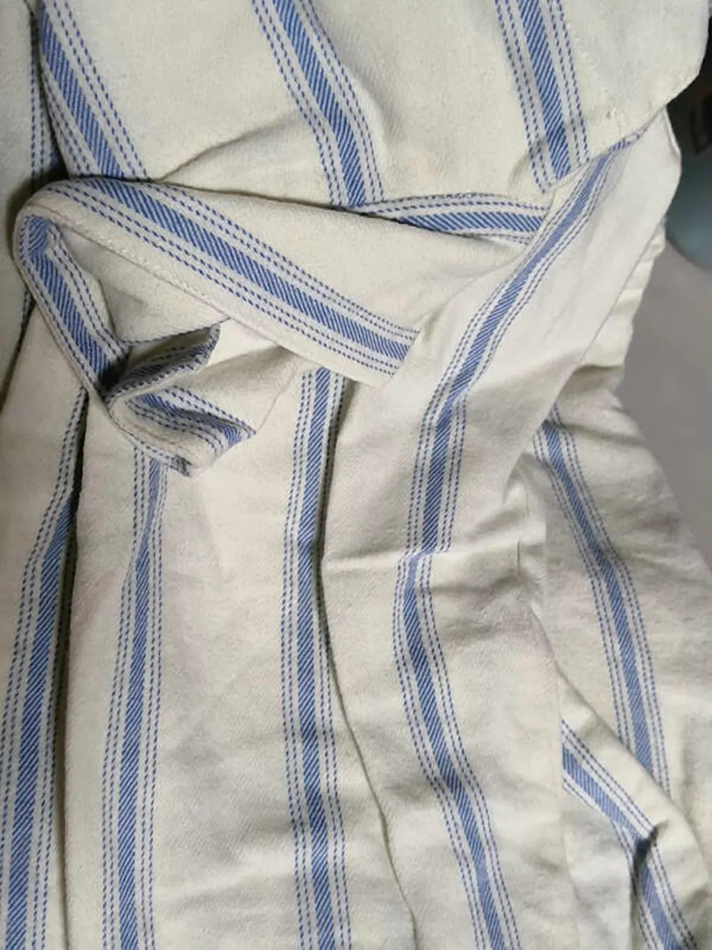 爽やかなブルー×ホワイトのストライプ柄は、どこか愛らしく、それでいて甘くなりすぎない絶妙なバランス。世代を問わず着やすく、お部屋での時間を明るく、軽やかに彩ります。