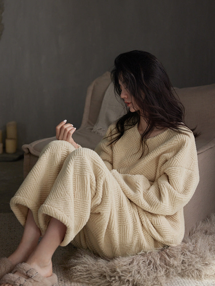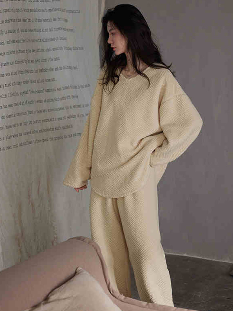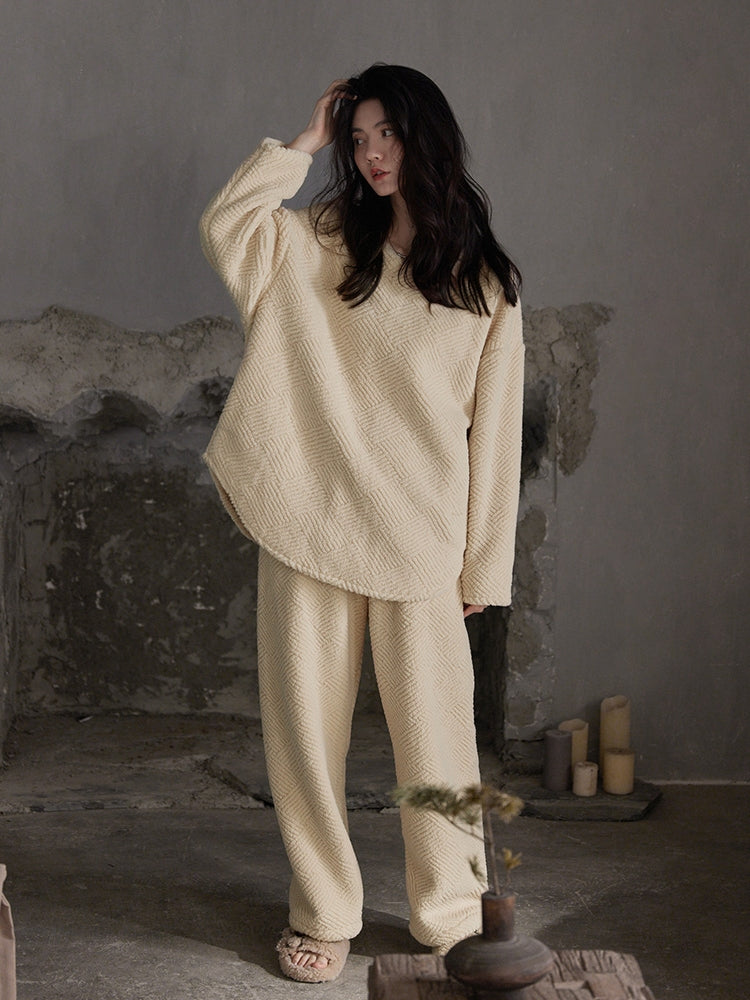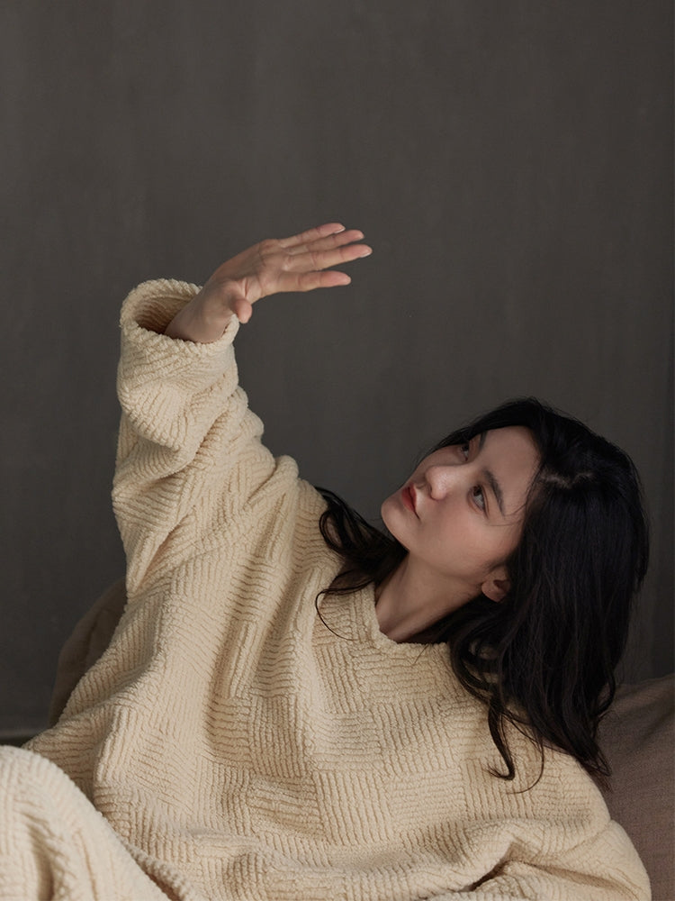 このパジャマセットは、秋冬シーズンに最適なふんわりとしたフランネル素材を使用しています。軽やかで柔らかな着心地が特徴で、リラックスタイムをさらに快適に過ごせます。ゆったりとしたシルエットが体に程よくフィットし、動きやすさも抜群です。 ベージュの落ち着いた色合いが上品な印象を与え、シンプルでありながらもモダンなデザインが魅力。外出せずにお家で過ごす時間にも、スタイリッシュにリラックスできます。  |