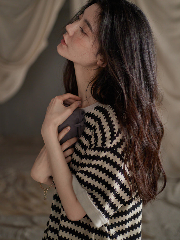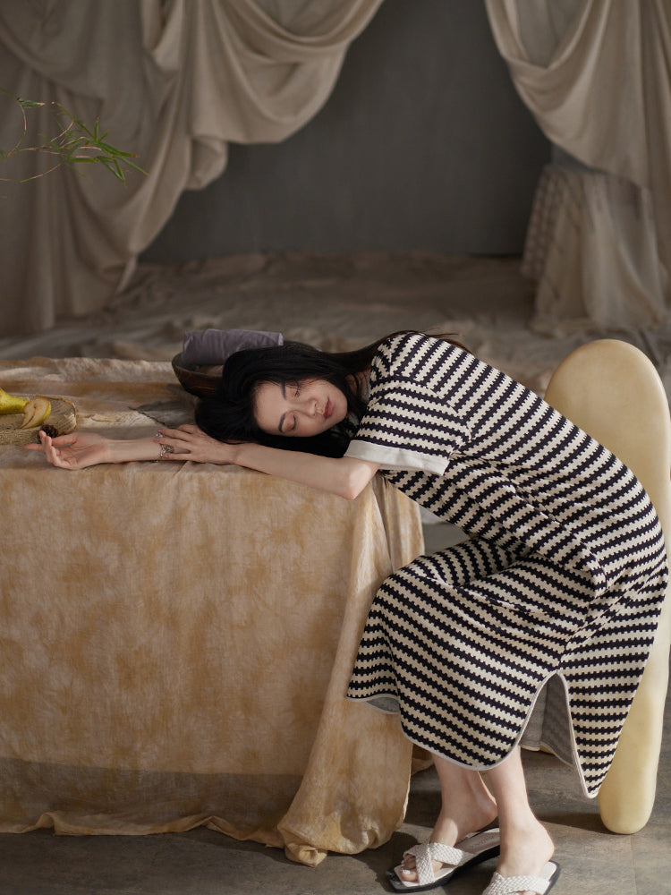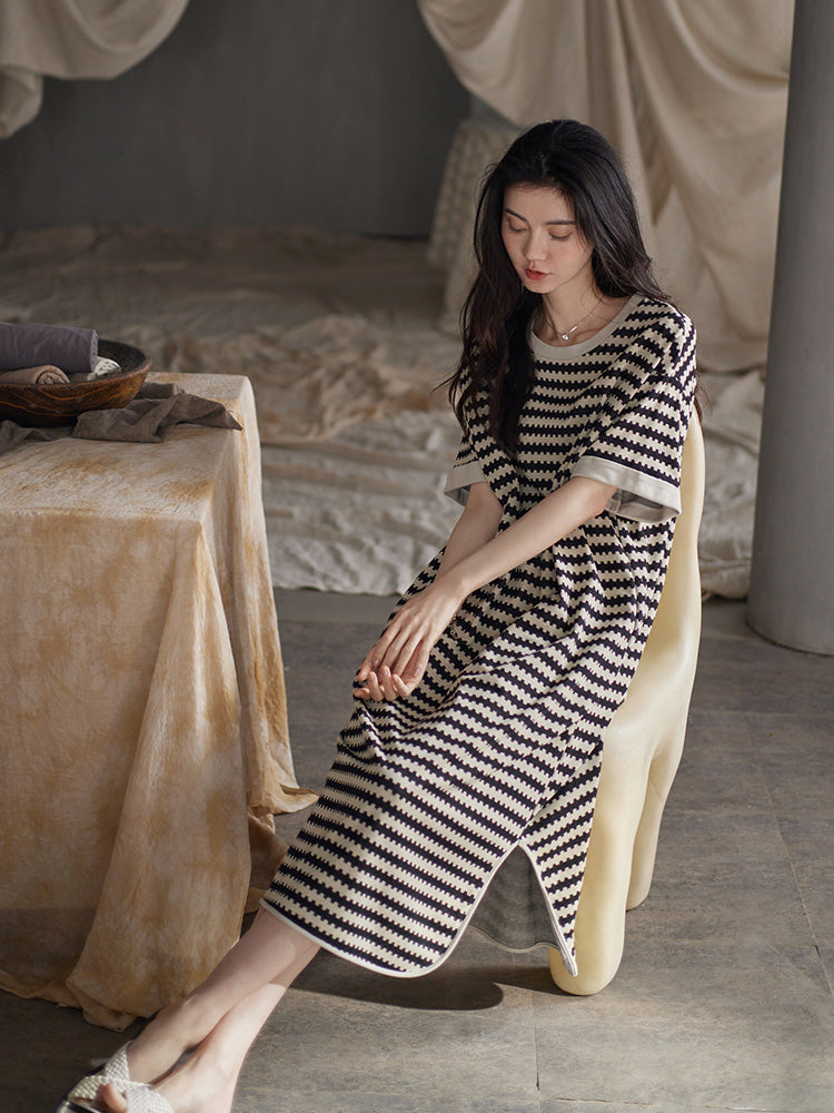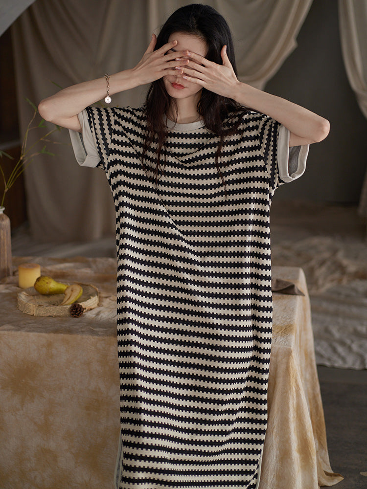 綿100%【高級パジャマ レディース】アイスコットン ストライプ柄スリープドレス 半袖 ふわふわ肌触り ルームウェア 外出可 可愛い