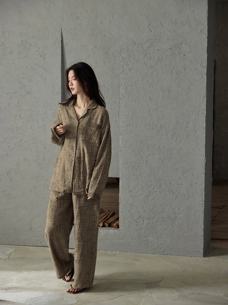 ■ 「ちょっとそこまで」も叶える、洗練されたデザイン 「パジャマ感」を抑えた、ゆったりとしたリラックスシルエット。 襟元や袖口のディテールにこだわり、急な宅配便の対応や、近所のコンビニへの外出もそのまま行ける「ワンマイルウェア」としても活躍します。 締め付けのない開放的な着心地は、おうち時間をより豊かに彩ります。