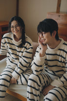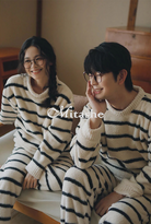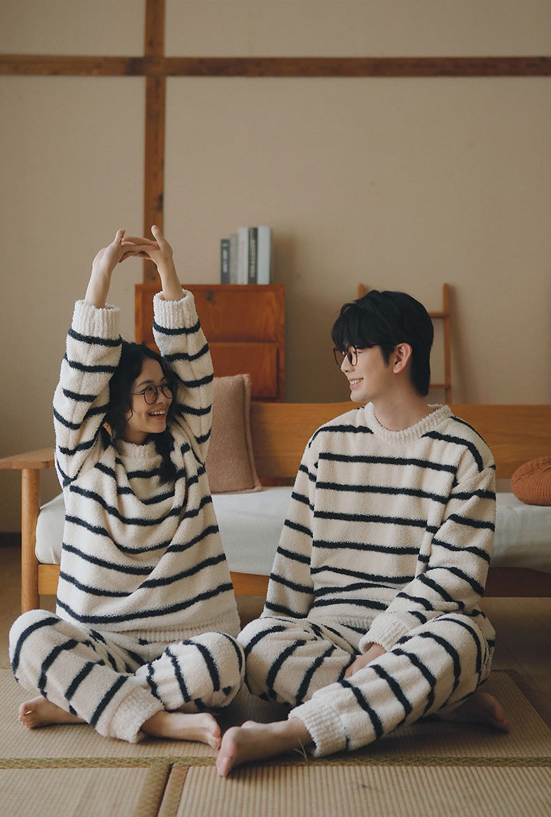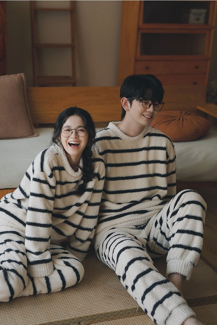 【25秋冬新作】 ふわふわで毛足の長い素材が、体をやさしく包み込むあたたかさ。秋冬のひとときも、心までほっと安らぐ着心地です。 白と黒の上品なストライプが、シンプルながらも洗練された印象を演出。 軽やかでありながらしっかり保温するので、家でのくつろぎも、おしゃれなお出かけ気分も安心。 プルオーバータイプのデザインで、着脱もラクラク。 二人で過ごす時間を、より特別であたたかくしてくれる、冬の必需品ペアパジャマです。 |