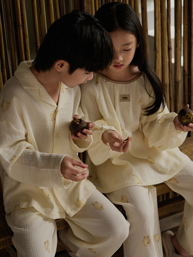 天然素材が紡ぐ、やさしさに満ちた毎日 軽やかで柔らかなコットン100%のダブルガーゼ素材を使用した、肌にやさしいキッズパジャマ。素肌にふれるたびに、自然に包まれているような安心感が広がります。 風通しの良いゆったりシルエットで、寝返りもおうち遊びも快適に。洗うほどにふんわりと柔らかくなり、毎日の眠りをやさしくサポートします。 落ち着いたアイボリーカラーに、愛らしい小さなひよこ(小鴨)柄をちりばめたデザインは、子どもの日常にちょうどいい遊び心をプラス。兄弟姉妹でおそろいにしても可愛く、贈り物にもおすすめです。 |