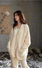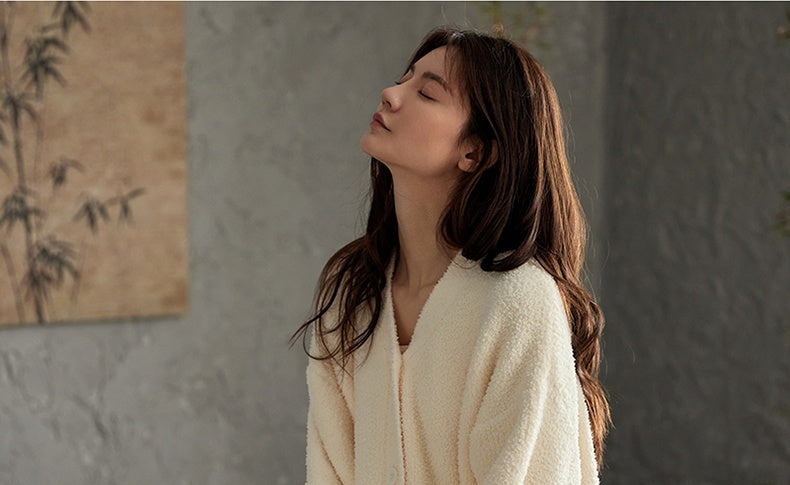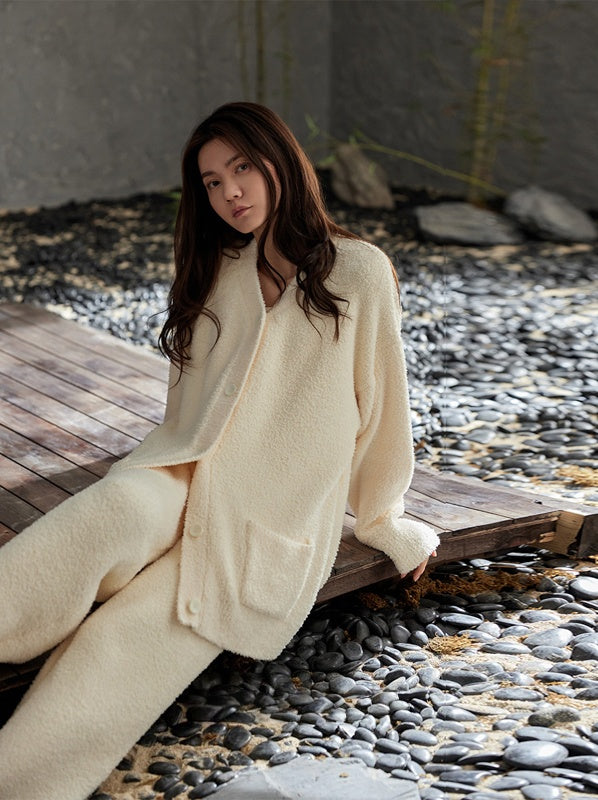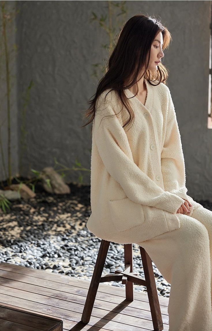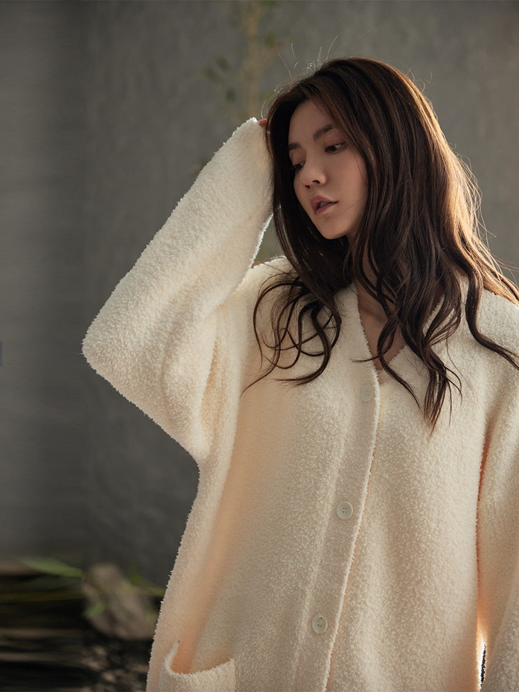 【25秋冬新作】 極上のやわらかさと、ぬくもりに包まれる心地よさ。 触れた瞬間にやすらぎをもたらす、肌にやさしいふんわり素材。 上品で落ち着いた杏色が、穏やかな大人の魅力を引き立て、リラックスタイムをより上質に。 開襟のシンプルなデザインに、内側はふんわりとした厚手の裏起毛仕様。 寒い季節も、柔らかく温かい着心地とエレガンスを兼ね備えた一着です。 |