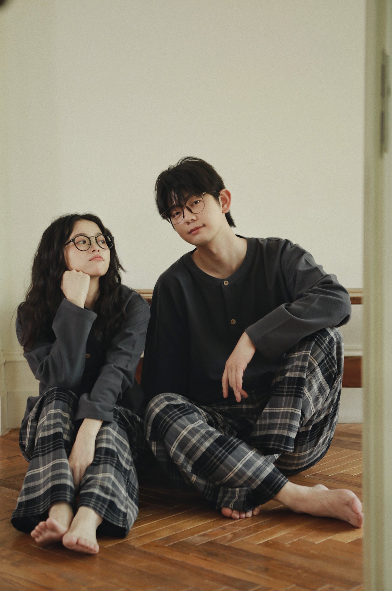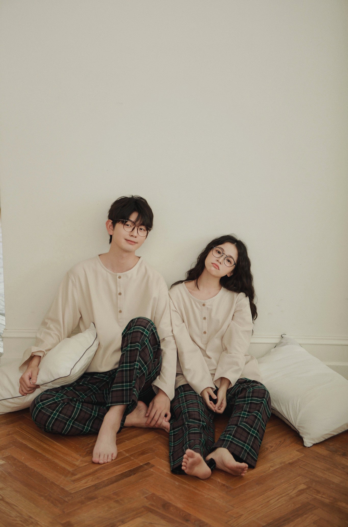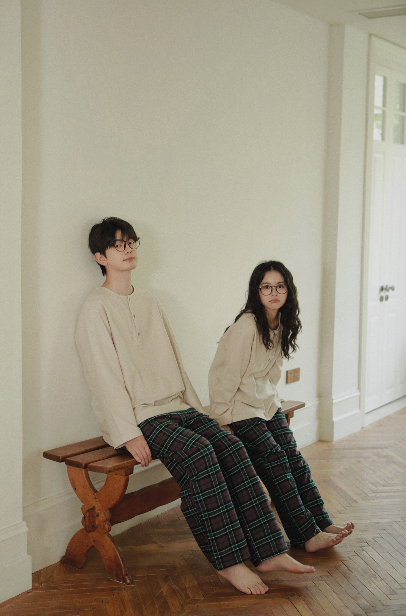 綿100%【上質ペアパジャマ】男女兼用 米色トップス×グリーングレー格子パンツ 丸首 長袖 ルームウェア 通気性 保温 外出可能 誕生日 結婚祝い プレゼント 【26年新作】