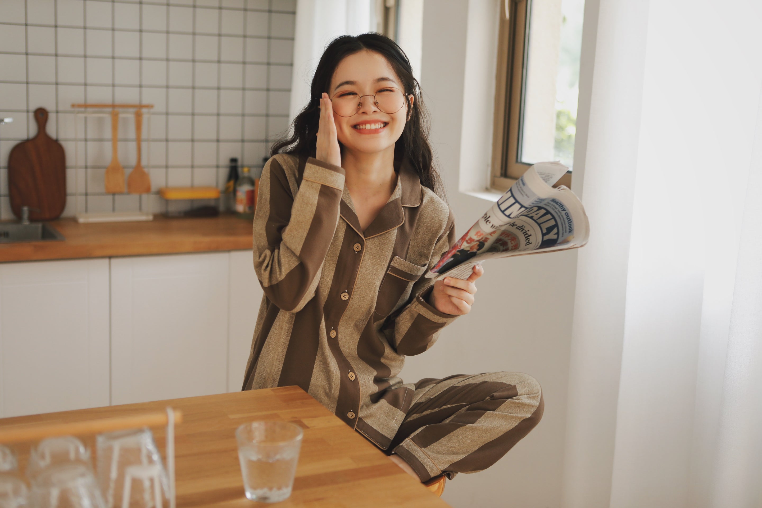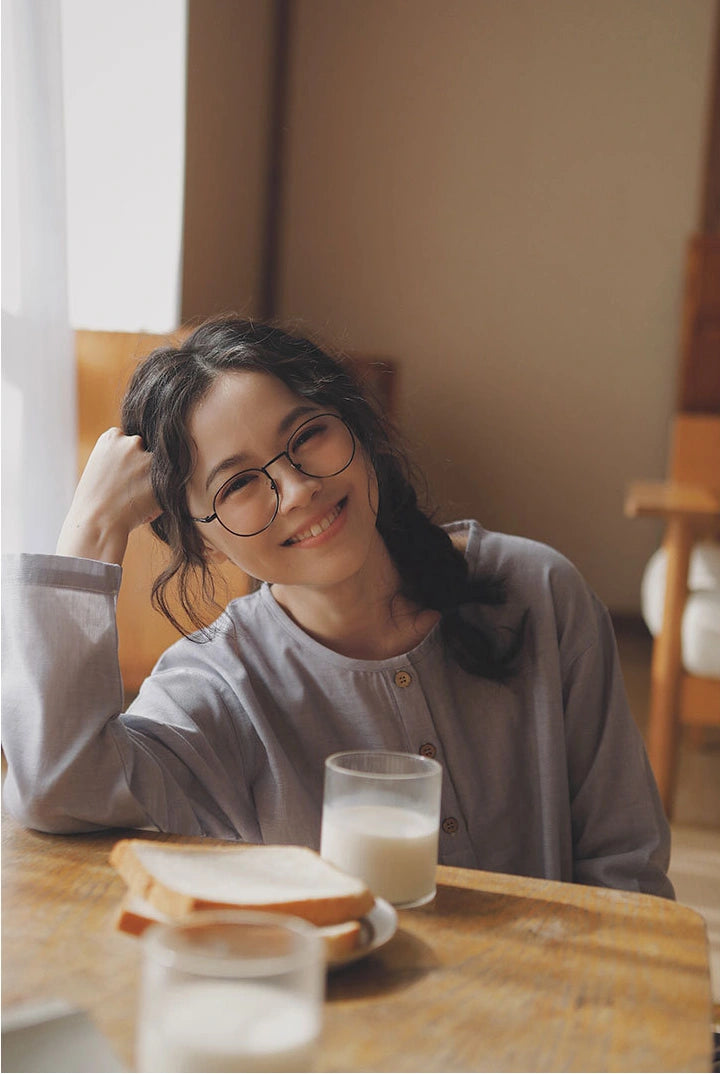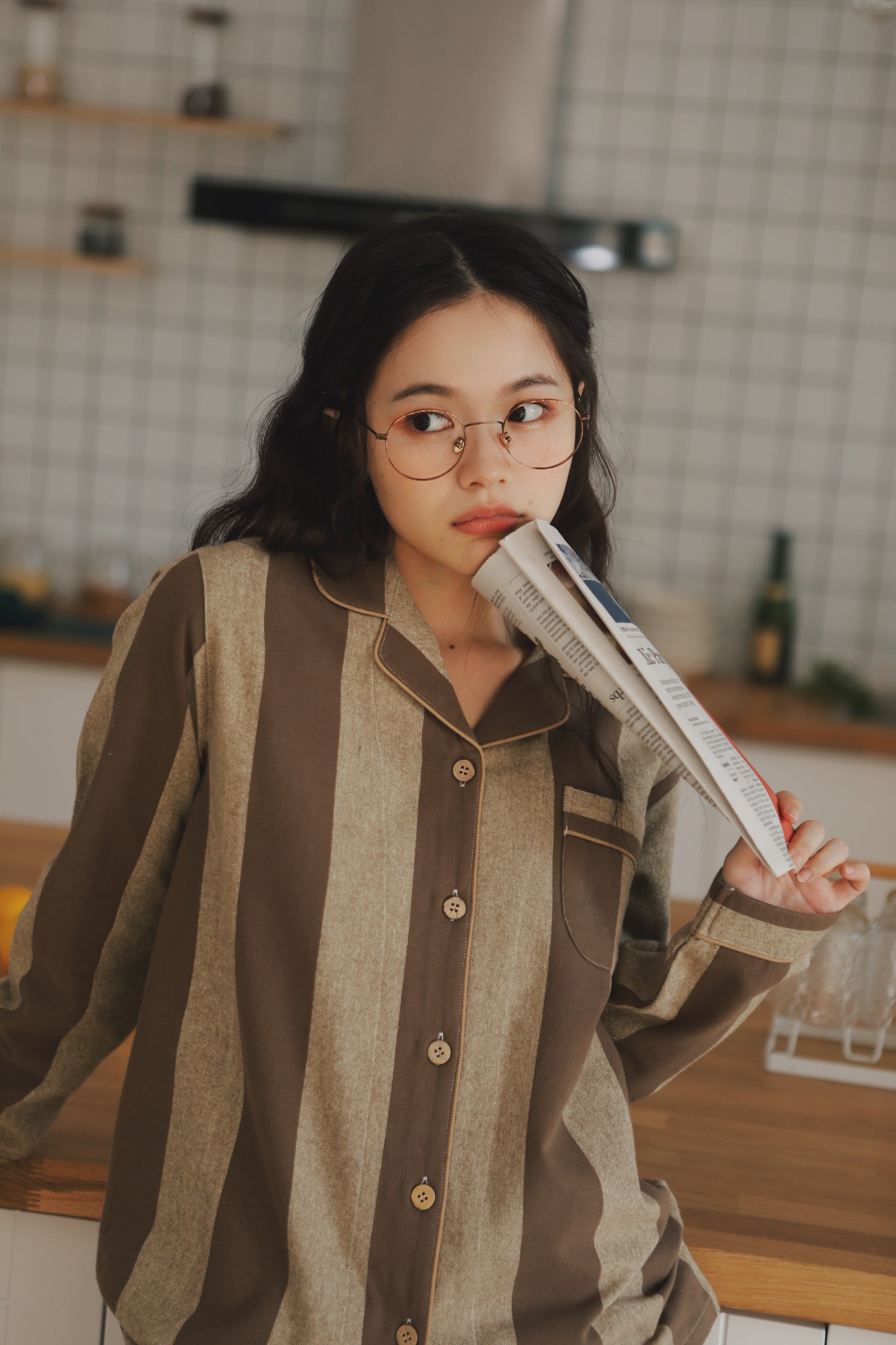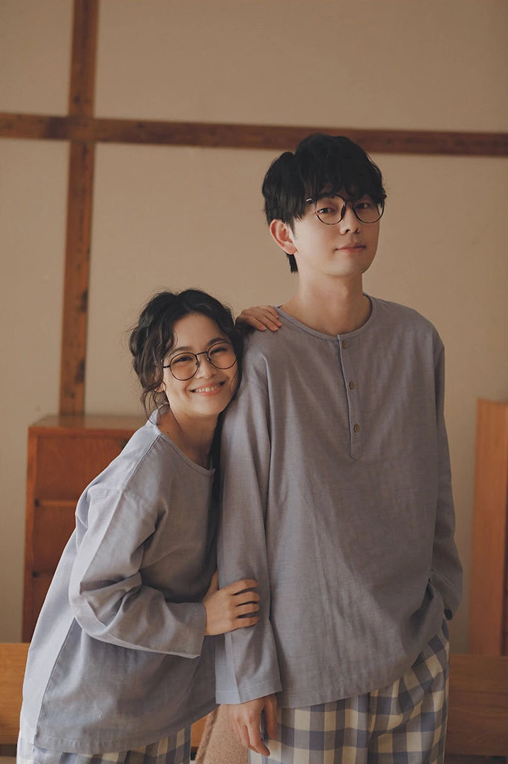 綿100%【上質ペアパジャマ】男女兼用 米色トップス×グリーングレー格子パンツ 丸首 長袖 ルームウェア 通気性 保温 外出可能 誕生日 結婚祝い プレゼント 【26年新作】