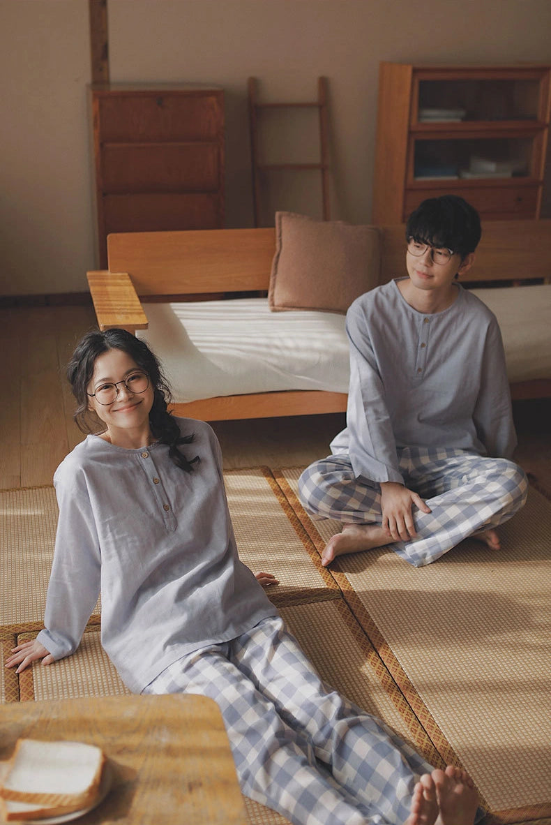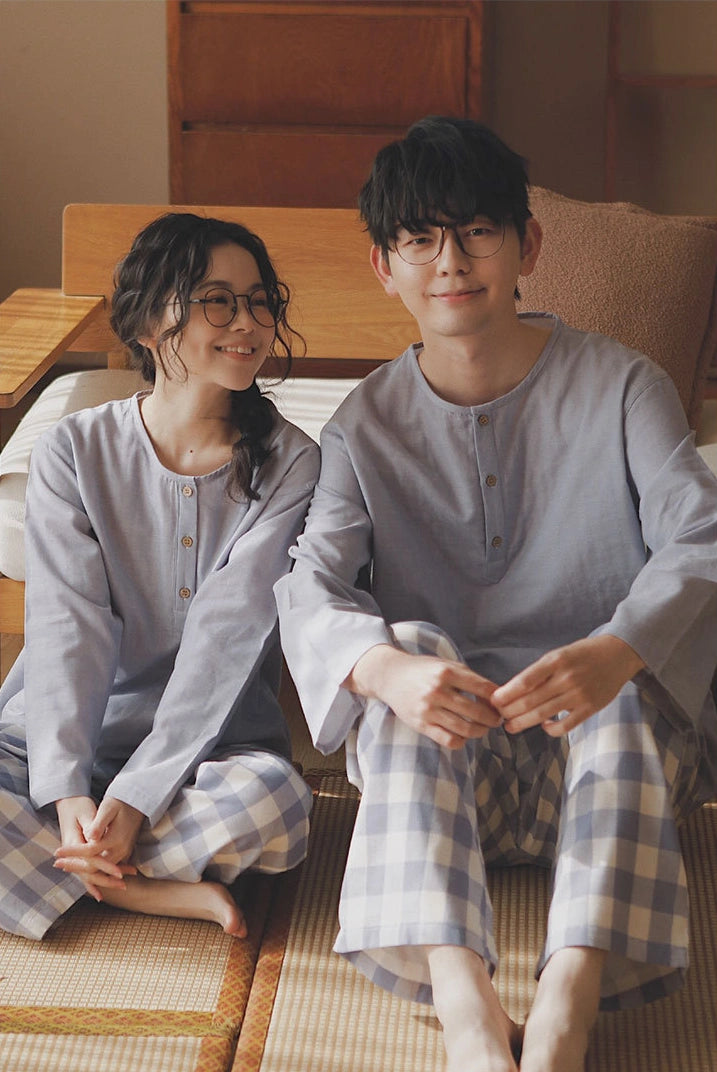綿 100%【ペアパジャマ】 誕生日 結婚祝い プレゼント 上質二重ガーゼ ライトブルートップス × ブルーグレーチェックパンツ ヘンリーネック 長袖 通気性 肌触り 外出可能 【26 年新作】