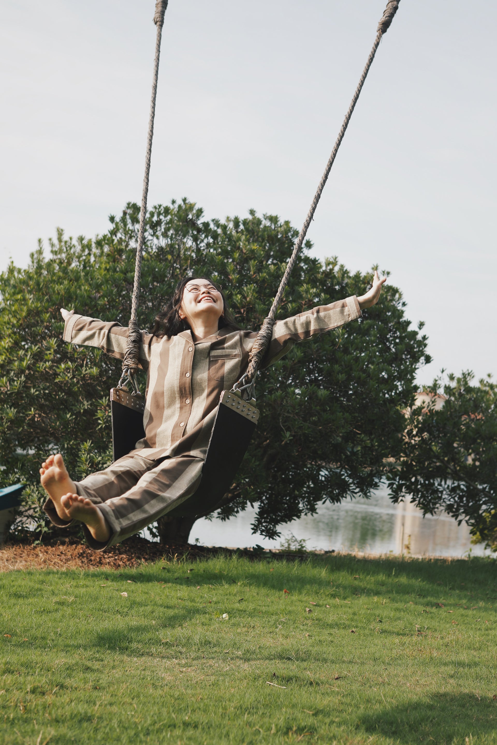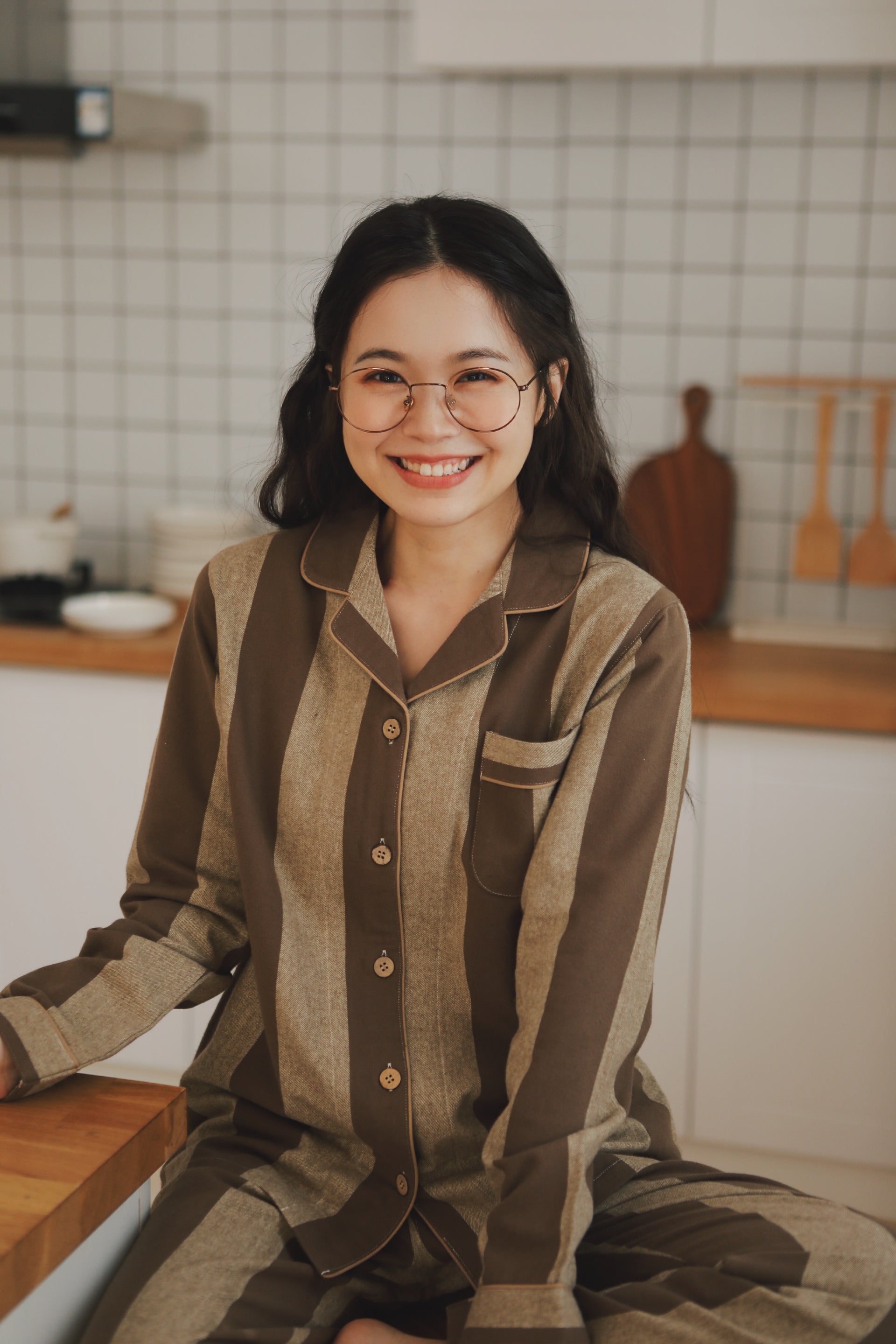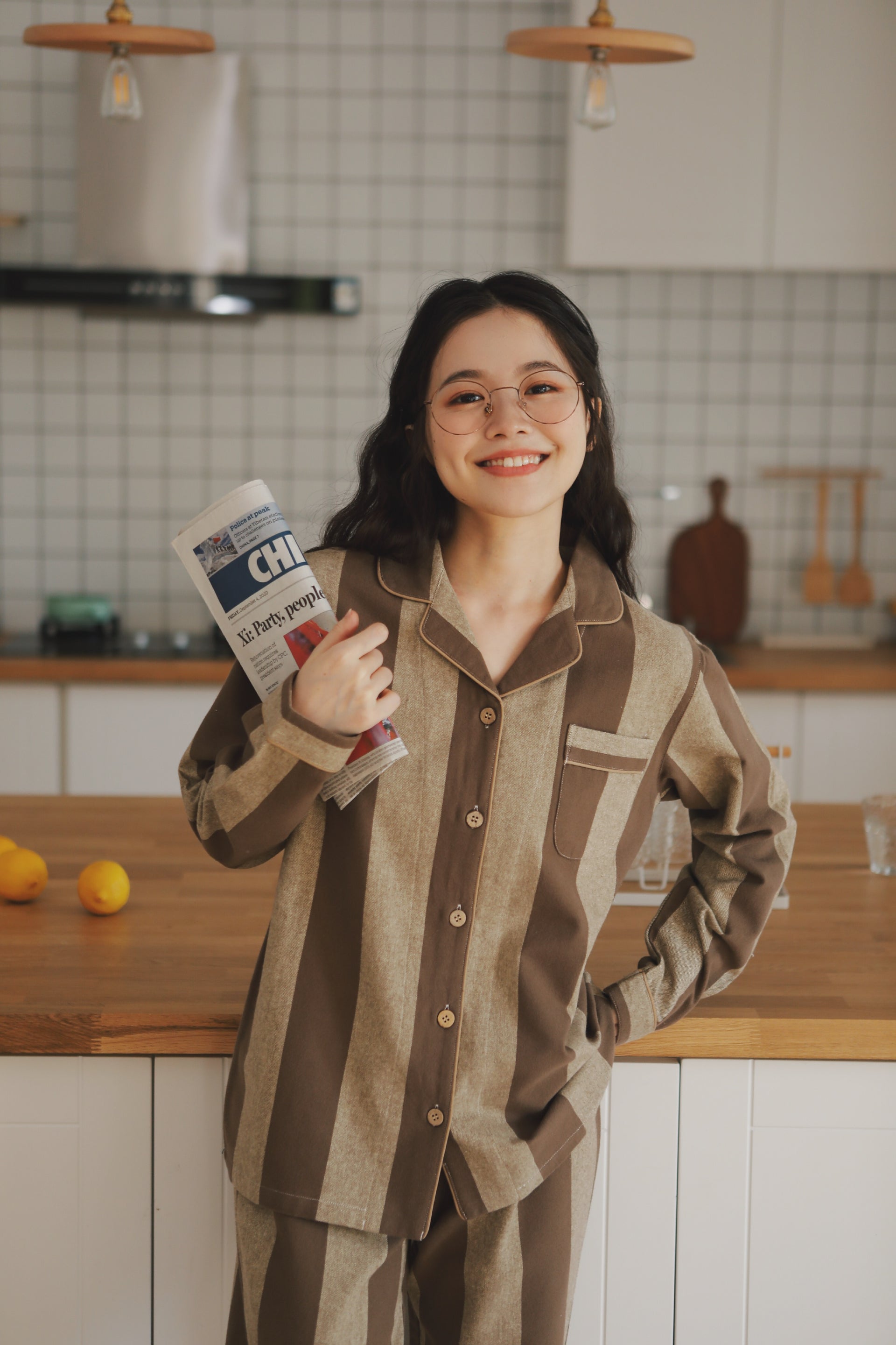 綿 100%【上質ガーゼペアパジャマ】男女兼用 ベージュトップス × グレーストライプパンツ 丸首 長袖 ルームウェア 通気性 肌触り 外出可能 誕生日 結婚祝い プレゼント 【26 年新作】