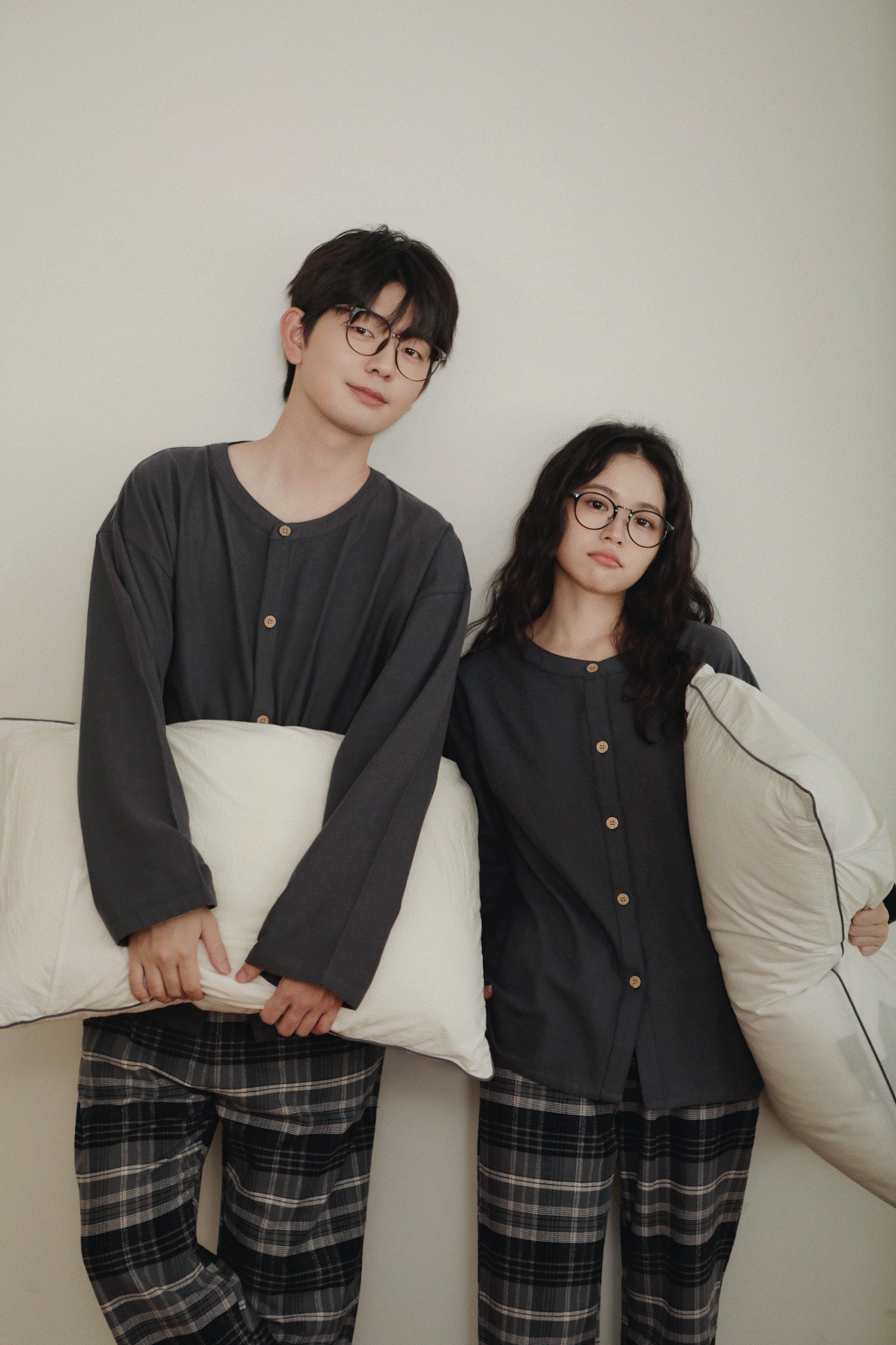 綿100%【高級ペアパジャマ】ブラック×グレー格子 男女兼用 丸首 長袖 ルームウェア 秋冬新作 誕生日 結婚祝い プレゼント【今期注目】