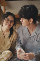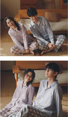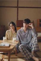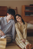 【 26年新作】 100% 純綿のガーゼ素材を使用し、春と秋のくつろぎ時間を柔らかく包み込みます。 通気性と吸湿性に優れ、汗をかいてもべたつかず、軽やかで快適な着心地を実現しました。 男女別カラー展開で、男性にはブルートップス × ブルーチェックパンツ、女性にはパープルトップス × パープルチェックパンツ、イエロートップス × イエローチェックパンツの 3 種類からお選びいただけます。 シンプルなオープンカラーデザインが自然な着こなしを演出し、ゆったりとしたリラックスシルエットで、家でのくつろぎ時間はもちろん、ちょっとした買い物や散歩にも違和感なく馴染みます。 ふたりで揃えて着ることで、春と秋の日常にさりげない爽やかさと上品さを添えるペアパジャマです。 |