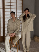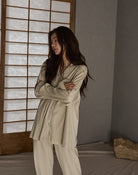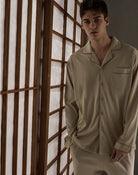 シンプルで上品な小さな翻襟デザインと長袖・長ズボンの上下セットは、ゆったりとしたリラックスシルエットで、動きを妨げず男女問わず快適に着用可能。