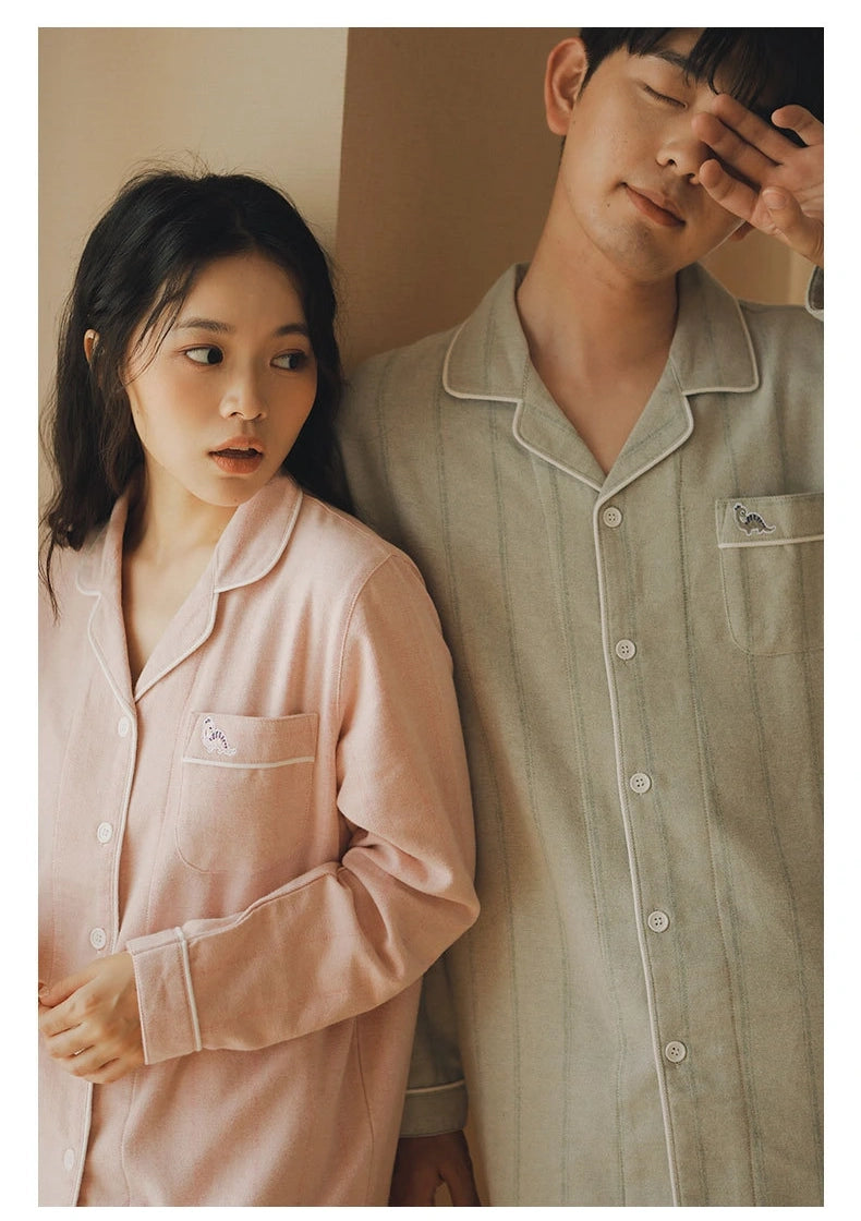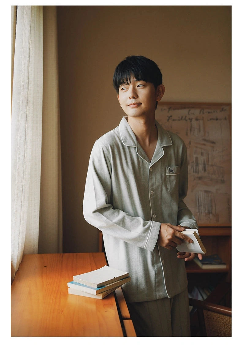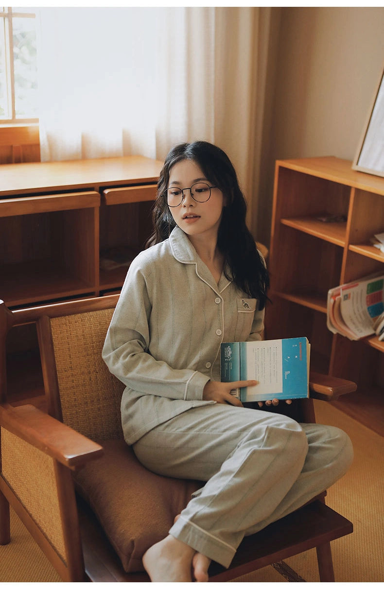 綿100%【上質ペアパジャマ】男女兼用 上品ブルー&ブラウンストライプ 襟付きボタン 長袖 ルームウェア 通気性 保温 快適な眠り 外出可能 【26年新作】