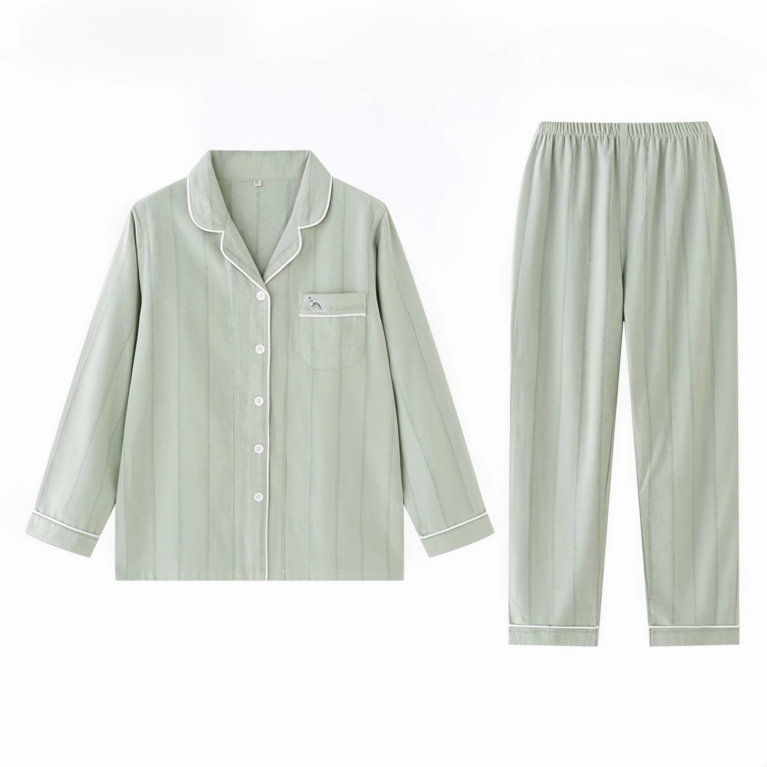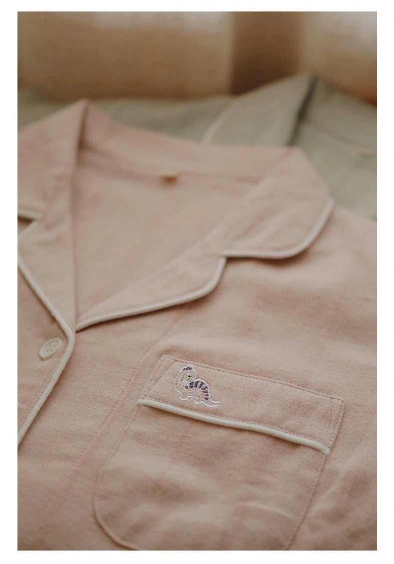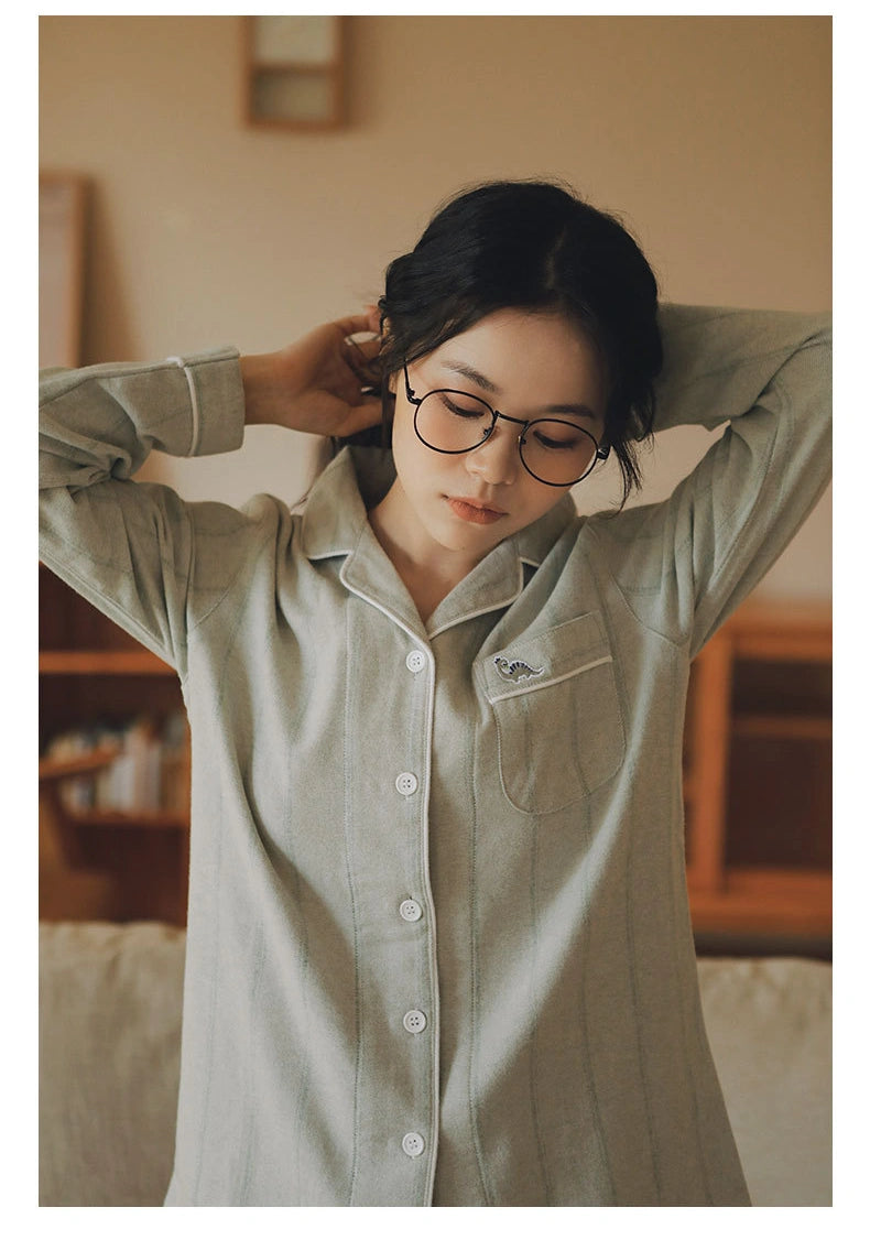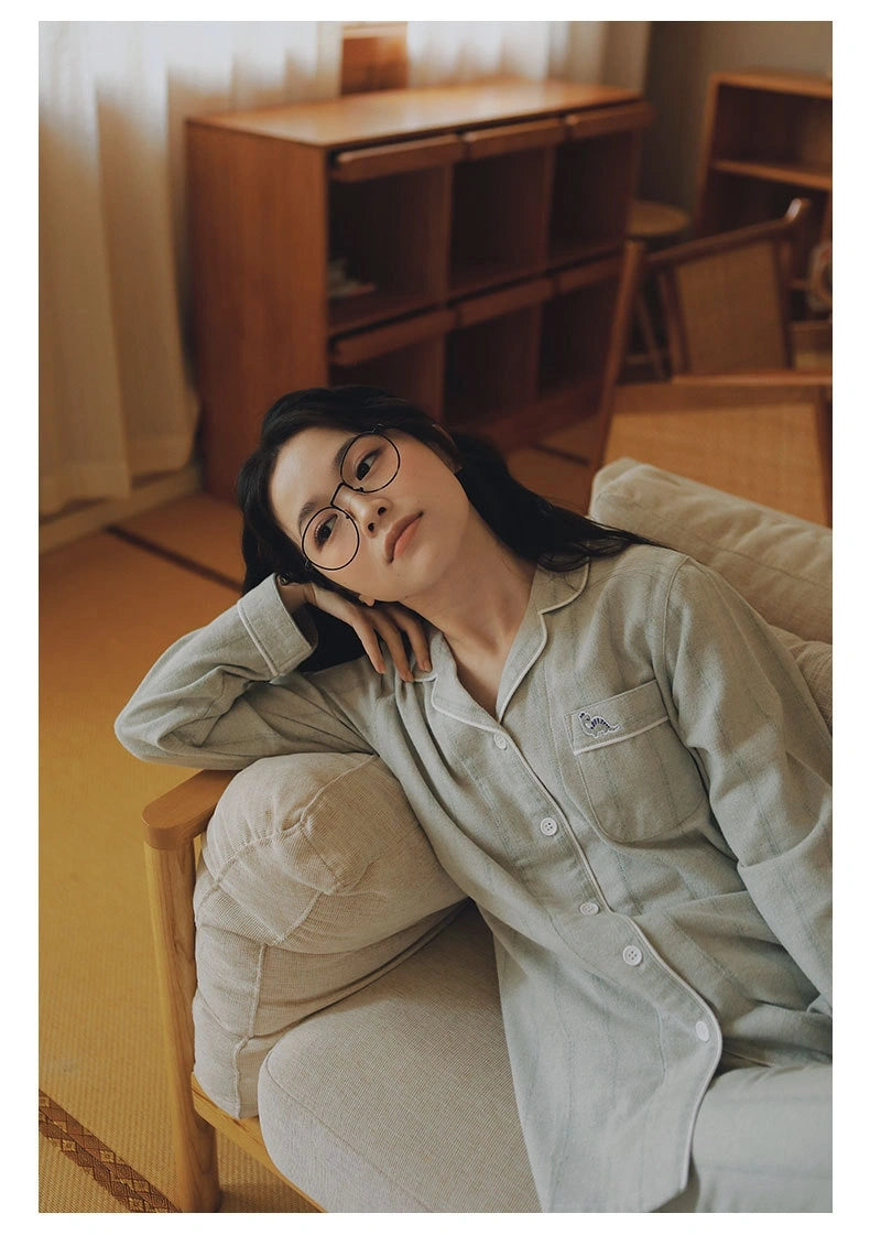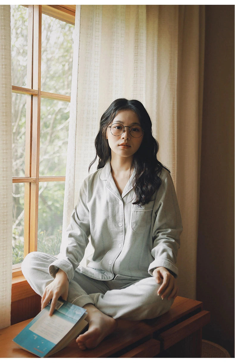 綿100%【上質ペアパジャマ】男女兼用 米色トップス×グリーングレー格子パンツ 丸首 長袖 ルームウェア 通気性 保温 外出可能 誕生日 結婚祝い プレゼント 【26年新作】